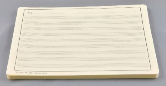 "STAR - Notenschreibpapier" 125g - hellchamois, glatte Oberfläche, so abgestimmt um dem Schreibgerät den idealen Wiederstand zu bieten. Das Papier wird extra für STAR hergestellt und ist u. a. speziell zum Noten schreiben an der Oberfläche und im Stoff geleimt. Seit Jahrzehnten das beliebteste Papier in Europa