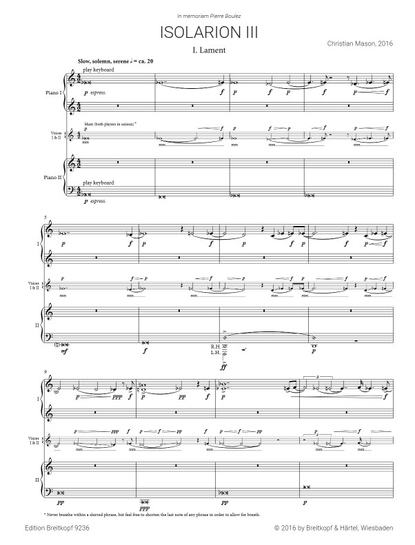 Isolarion III is a transcription and re-composition of my orchestral work Isolarion: Rituals of Resonance (2013), which was itself an elaboration and expansion of an earlier brass quintet. This piece reduces what was a highly embellished, ornamented and colour-driven score to its essential constructive elements: lines and layers, which collide and cohere in a mercurially flowing continuity. The first movement of the orchestral version was dedicated to Pierre Boulez, who had commissioned work Isolarion: Rituals of Resonance through the Lucerne Festival Academy. In light of the recent news of his death, I dedicate this piano duo to his memory.